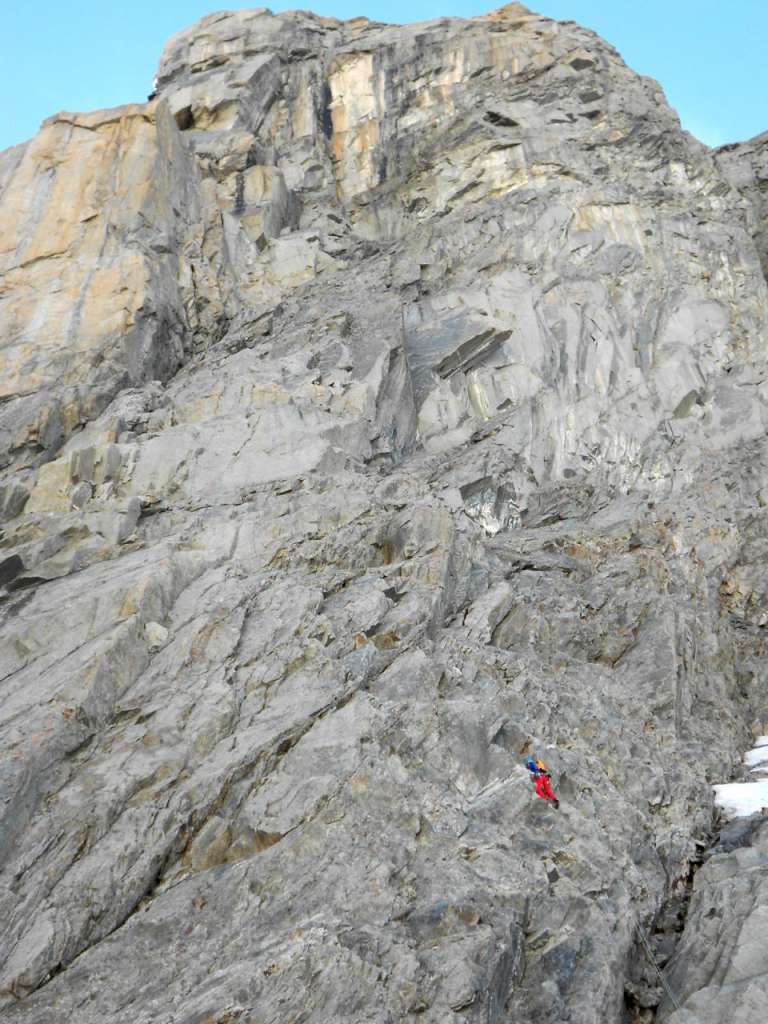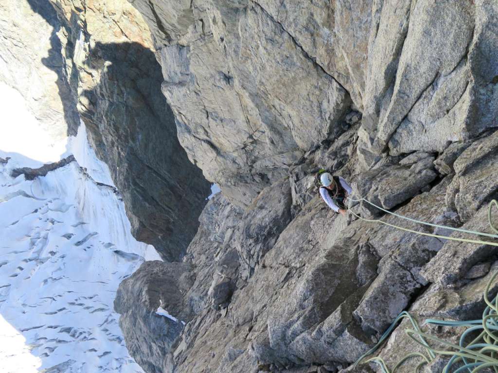 L’avvicinamento è lungo e complesso così come l’itinerario. Brevi tratti d’arrampicata, doppie, traversate e labirinto di crepacci da risolvere lungo il bacino basso del Freney… tutto ciò dovremo ancora affrontarlo in senso opposto dopo aver salito e sceso la via. Ci ritroviamo per primi all’attacco dell’itinerario e concateniamo tiro dopo tiro. Andrea è davvero un fenomeno, mette le scarpette una volta o due all’anno, non scala mai in falesia e mi segue come se fosse un arrampicatore sfegatato ed assiduo. Tanta sana invidia per la sua naturale prestanza fisica e mentale. Solo il tiro di artificiale lo prova un pochettino, ma imparando a fare artif sulla Ratti Vitali, direi che è normale dato quanto strapiomba il tiro. Le tre cordate si ricompattano, Andrea smonta un blocco di roccia da 50×50 che per fortuna non colpisce nessuno. Proseguiamo senza fretta ma con determinazione verso l’alto, ci siamo quasi. L’ultimo muro si presenta come una gigantesca placca solcata de diversi diedri a sinistra, e scaglie rotte a destra. Quando salii questa via la prima volta, sbagliai diedro e mi ritrovai su terreno molto difficile. Questa volta lo azzecco e poco dopo ci catapultiamo in vetta. La vista è spettacolare, la soddisfazione grandissima. Uno sguardo verso il basso, lato val Veny, e siamo contenti di riscendere in doppia lungo la via evitando la decrepita via normale.