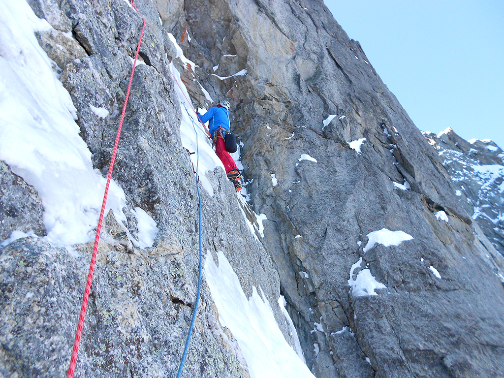 Proseguiamo inesorabili, anche se col diminuire del ghiaccio, ad ogni uscita di tiro Andrea mi guarda sempre più perplesso con aria interogativa. Dopo qualche tiro non mi guarda neanche più…segue a testa bassa. Ilaria ci richiama dicendoci che è già salit e scesa e sta facendo la tintarella sotto al rifugio: è mezzogiorno, e noi siamo a 3 tiri dalla fine. Le corde diventano improvvisamente elastiche e si allungano, si allungano, così tanto che con un tirella da 150m siamo in cresta. O meglio siamo incastrati sotto un masso gigantesco che se si stacca facciamo come Willy il Coyote: abbracciati al masso in caduta libera. A parte gli scherzi, il “tappo” ci impedisce sia di lambire i raggi del Sole sia di vedere dall’altra parte della cresta. Ci concediamo un ultimo tirello su cornice per godere della vista e capire il perché di tutta quella fatica! Lo scenario è da urli, un panorama indimenticabile! Non vorremmo davvero scendere… ma restare li sarebbe davvero scomodo