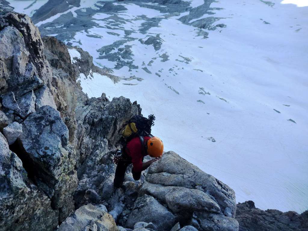 Avevo già percorso il tratto sommitale delle creste uscendo dal couloir a Z sulla parete nord, e ne avevo un bel ricordo. Questa volta ho percorso anche lo sperone iniziale del Promontoire e ne vale davvero la pena. La roccia ottima, i passaggi mai estremi ma che richiedono un po’ di dimestichezza nella ricerca dell’itinerario, l’eleganza della linea di salita ne fanno una salita da non perdere.